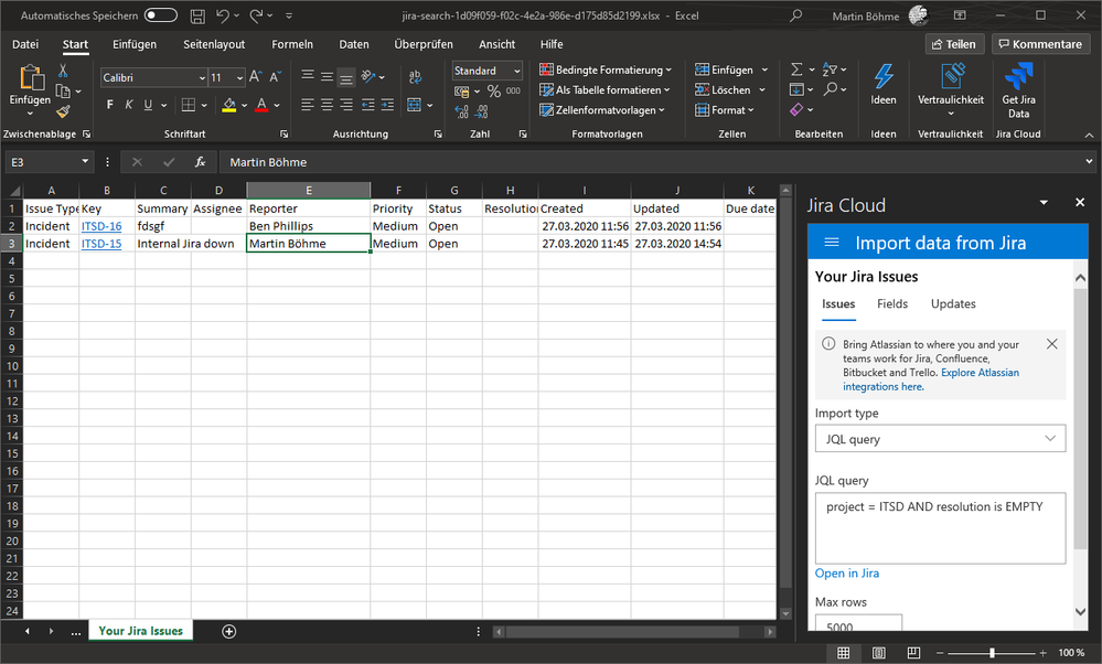 Than right click and choose the option view in excel. If your jira installation is new you might not see it. From the project drop down list select your jira project and then search for your desired data fields using the search bar just below it. Excel is storing my data and drawing graphs for me but i need to have data from jira automatically based on filters i apply. Now it s time to edit the file and add a parameter in a new line.